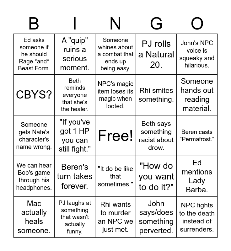 This bingo card has a free space and 24 words: Beren's turn takes forever., PJ laughs at something that wasn't actually funny., NPC's magic item loses its magic when looted., Mac actually heals someone., John's NPC voice is squeaky and hilarious., Ed asks someone if he should Rage *and* Beast Form., CBYS?, A "quip" ruins a serious moment., Beth says something racist about drow., "It do be like that sometimes.", Rhi smites something., Someone gets Nate's character's name wrong., "How do you want to do it?", Ed mentions Lady Barba., Beth reminds everyone that she's the healer., John says/does something perverted., Beren casts "Permafrost.", Someone whines about a combat that ends up being easy., Someone hands out reading material., "If you've got 1 HP you can still fight.", NPC fights to the death instead of surrenders., We can hear Bob's game through his headphones., PJ rolls a Natural 20. and Rhi wants to murder an NPC we just met..