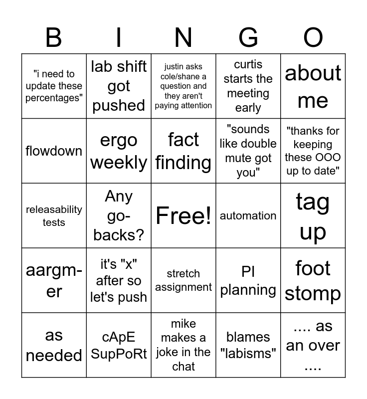This bingo card has a free space and 24 words: it's "x" after so let's push, cApE SupPoRt, fact finding, as needed, about me, "i need to update these percentages", flowdown, lab shift got pushed, automation, stretch assignment, "sounds like double mute got you", releasability tests, PI planning, foot stomp, ergo weekly, blames "labisms", tag up, justin asks cole/shane a question and they aren't paying attention, "thanks for keeping these OOO up to date", Any go-backs?, .... as an over ...., aargm-er, curtis starts the meeting early and mike makes a joke in the chat.
