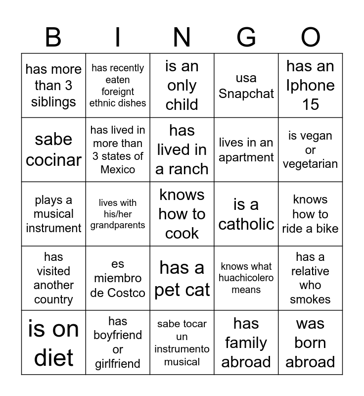 This bingo card has 30 words: is on diet, has a BMW, has lived in a ranch, speaks more than one language, has an Iphone 15, has more than 3 siblings, has recently eaten foreignt ethnic dishes, has a pet cat, is a catholic, was born abroad, has visited another country, has lived in more than 3 states of Mexico, believes that cold pizza is a good option for breakfast, has family abroad, has a relative who smokes, celebrates Christmas, lives with his/her grandparents, knows how to cook, knows what huachicolero means, is vegan or vegetarian, plays a musical instrument, has boyfriend or girlfriend, is an only child, lives in an apartment, knows how to ride a bike, sabe cocinar, es miembro de Costco, sabe tocar un instrumento musical, usa Snapchat and ha corrido un maratón.