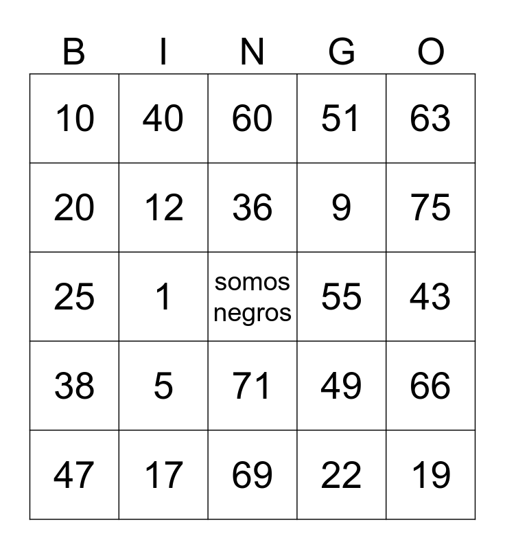 This bingo card has a free space and 24 words: 5, 17, 36, 47, 63, 10, 20, 40, 55, 71, 9, 25, 49, 66, 12, 22, 43, 60, 75, 1, 19, 38, 51 and 69.