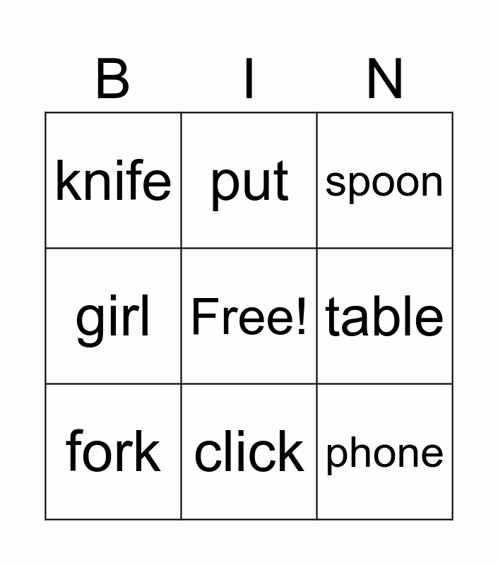 This bingo card has a free space and 8 words: table, spoon, put, fork, knife, phone, girl and click.