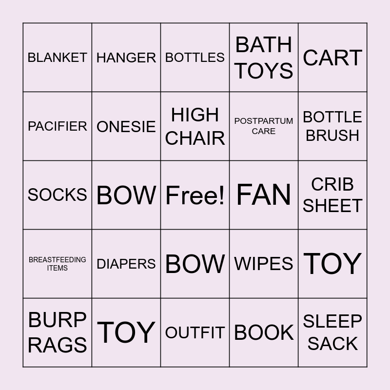 This bingo card has a free space and 24 words: DIAPERS, TOY, HIGH CHAIR, BURP RAGS, CART, BLANKET, PACIFIER, HANGER, FAN, BOW, POSTPARTUM CARE, SOCKS, WIPES, TOY, ONESIE, BOOK, CRIB SHEET, BOTTLES, BOTTLE BRUSH, BOW, SLEEP SACK, BREASTFEEDING ITEMS, BATH TOYS and OUTFIT.