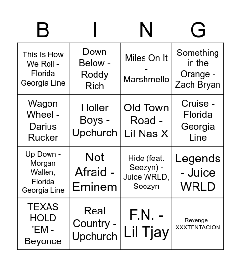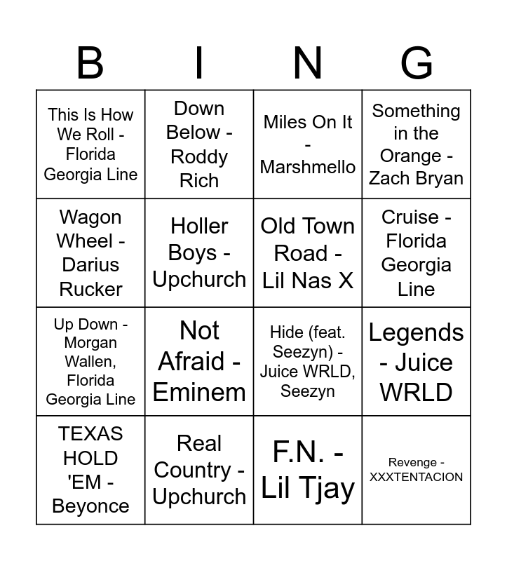 This bingo card has 22 words: Real Country - Upchurch, Country Roads - John Denver, Down Below - Roddy Rich, Jolene - Dolly Parton, Holler Boys - Upchurch, Old Town Road - Lil Nas X, This Is How We Roll - Florida Georgia Line, Miles On It - Marshmello, Hide (feat. Seezyn) - Juice WRLD, Seezyn, Revenge - XXXTENTACION, Up Down -Morgan Wallen, Florida Georgia Line, Something in the Orange - Zach Bryan, Tennessee Whiskey - Chris Stapleton, I Had Some Help (Feat. Morgan Wallen) - Post Malone, F.N. - Lil Tjay, Toes - Zac Brown Band, Legends - Juice WRLD, TEXAS HOLD 'EM - Beyonce, Not Afraid - Eminem, Wagon Wheel - Darius Rucker, Cruise - Florida Georgia Line and 2 AM - King Von.