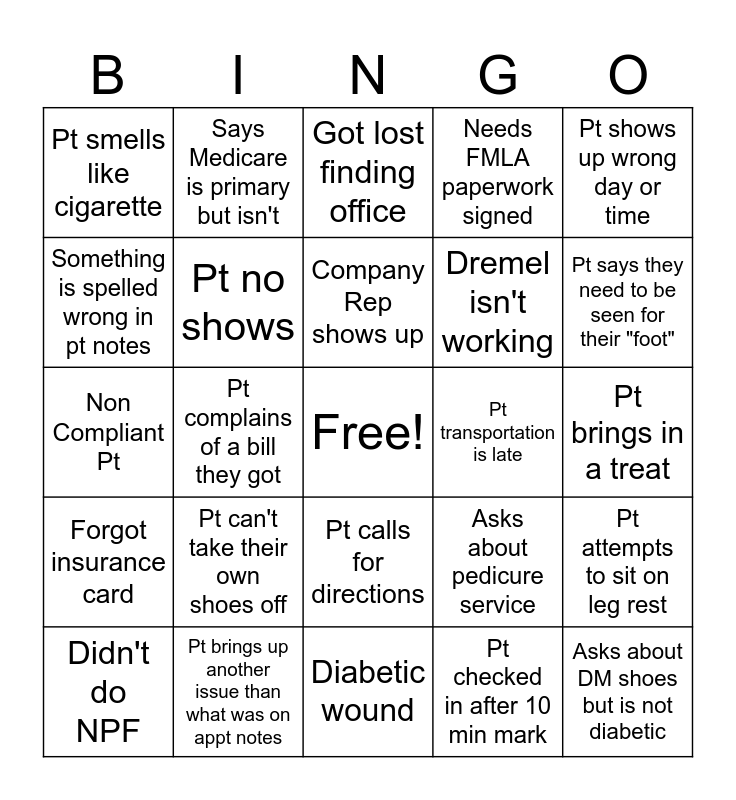 This bingo card has a free space and 24 words: Pt can't take their own shoes off, Pt brings up another issue than what was on appt notes, Company Rep shows up, Didn't do NPF, Pt shows up wrong day or time, Pt smells like cigarette, Something is spelled wrong in pt notes, Says Medicare is primary but isn't, Pt transportation is late, Pt calls for directions, Dremel isn't working, Non Compliant Pt, Asks about pedicure service, Pt attempts to sit on leg rest, Pt no shows, Pt checked in after 10 min mark, Pt brings in a treat, Got lost finding office, Pt says they need to be seen for their "foot", Pt complains of a bill they got, Asks about DM shoes but is not diabetic, Forgot insurance card, Needs FMLA paperwork signed and Diabetic wound.
