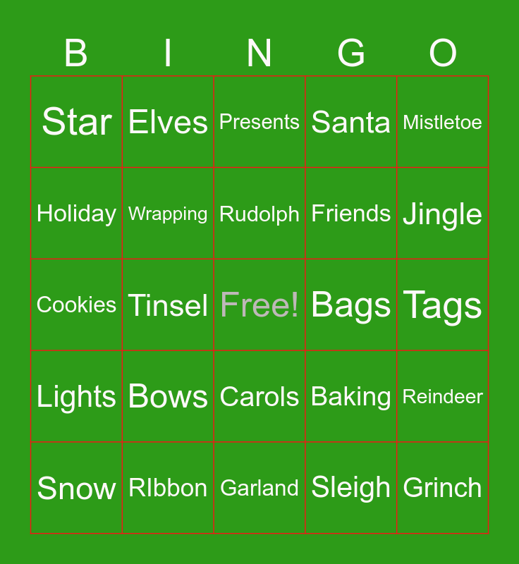 This bingo card has a free space and 29 words: Snow, Holly, Tinsel, Tree, Star, Presents, Wrapping, Bows, Bags, RIbbon, Tags, Grinch, Garland, Sleigh, Jingle, Bells, Carols, Lights, Mistletoe, Cookies, Baking, Family, Friends, Holiday, Santa, Elves, Reindeer, Rudolph and Frosty.
