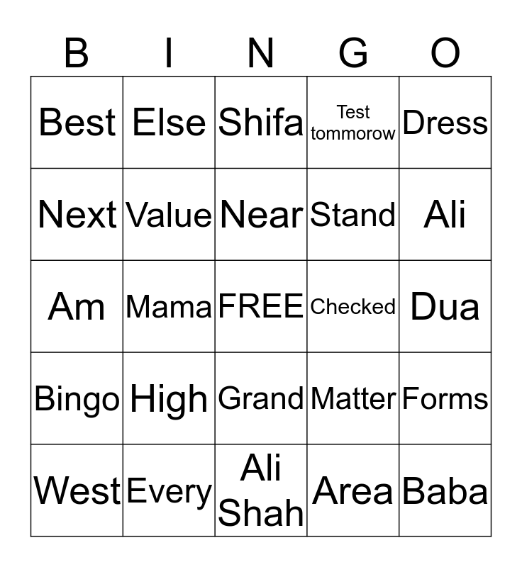 This bingo card has a free space and 24 words: High, Every, Near, West, Dress, Best, Next, Else, Checked, Grand, Stand, Am, Matter, Forms, Value, Area, Dua, Shifa, Ali, Mama, Baba, Bingo, Test tommorow and Ali Shah.