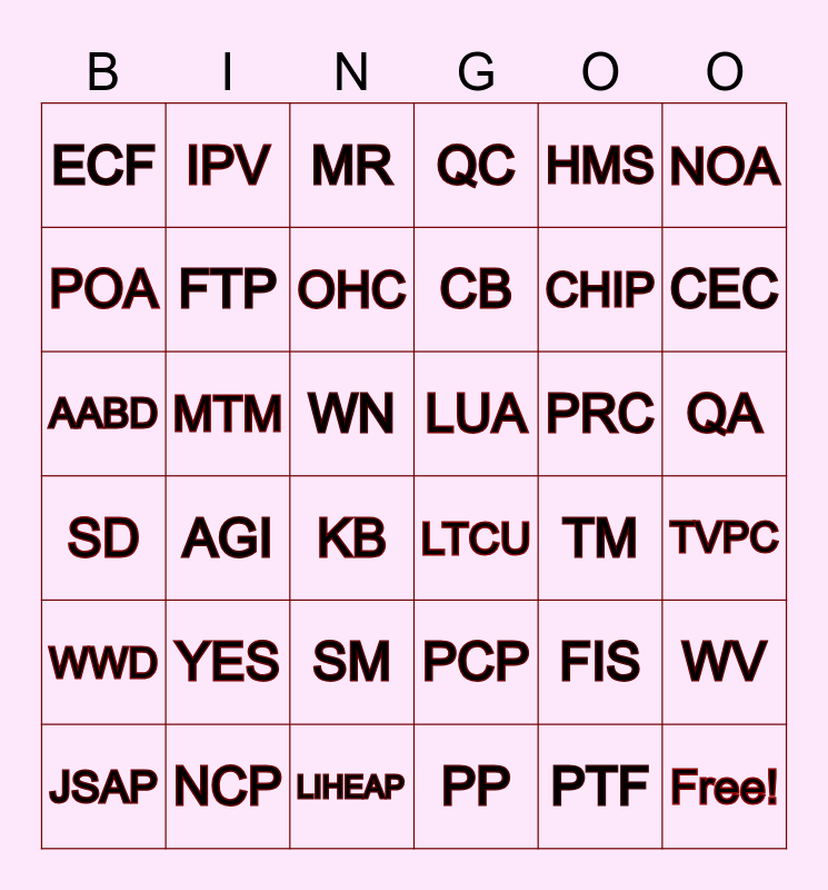 This bingo card has 42 words: PTF, FTP, MA, PRC, TVPC, AGI, AABD, GC, MR, QA, WN, CB, CEC, HMS, NCP, SD, WV, CHIP, Free!, IPV, NOA, SM, WWD, ECF, DP, JSAP, OHC, SOLQ, YES, FIS, EWS, LUA, POA, TM, LIHEAP, KB, LTCU, MTM, PCP, PP, QC and RMA.