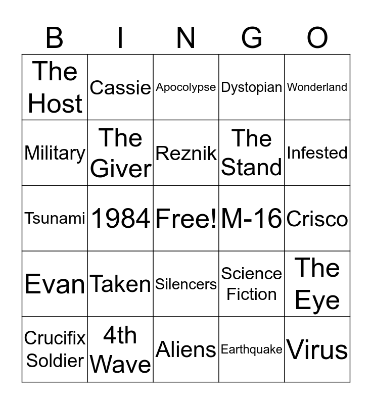This bingo card has a free space and 24 words: Taken, 4th Wave, Reznik, Crucifix Soldier, Wonderland, The Host, Military, Cassie, M-16, Silencers, The Stand, Tsunami, Science Fiction, The Eye, The Giver, Earthquake, Crisco, Apocolypse, Infested, 1984, Virus, Evan, Dystopian and Aliens.