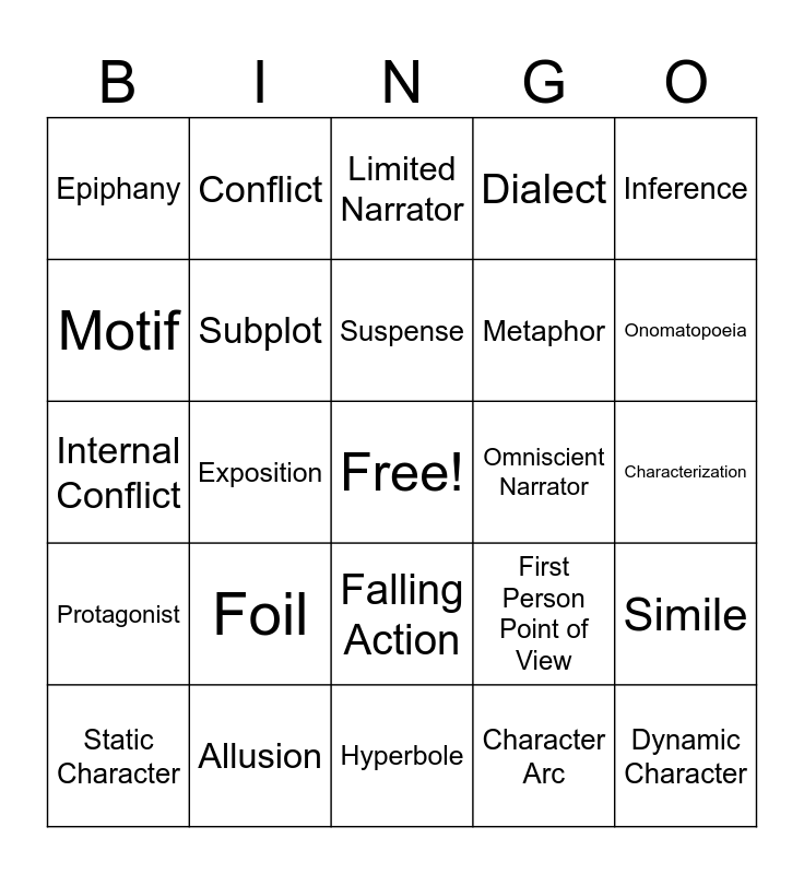 This bingo card has a free space and 47 words: Allegory, Allusion, Antagonist, Character Arc, Characterization, Climax, Conflict, Dialogue, Dialect, Dynamic Character, Epiphany, Exposition, Falling Action, First Person Point of View, Flashback, Foreshadowing, Foil, Hyperbole, Imagery, Inference, Internal Conflict, Irony, Limited Narrator, Metaphor, Mood, Motif, Narrative, Narrative Hook, Omniscient Narrator, Onomatopoeia, Oxymoron, Paradox, Personification, Plot, Point of View, Protagonist, Resolution, Rising Action, Setting, Simile, Static Character, Subplot, Suspense, Symbolism, Theme, Theme Statement and Third Person Point of View.