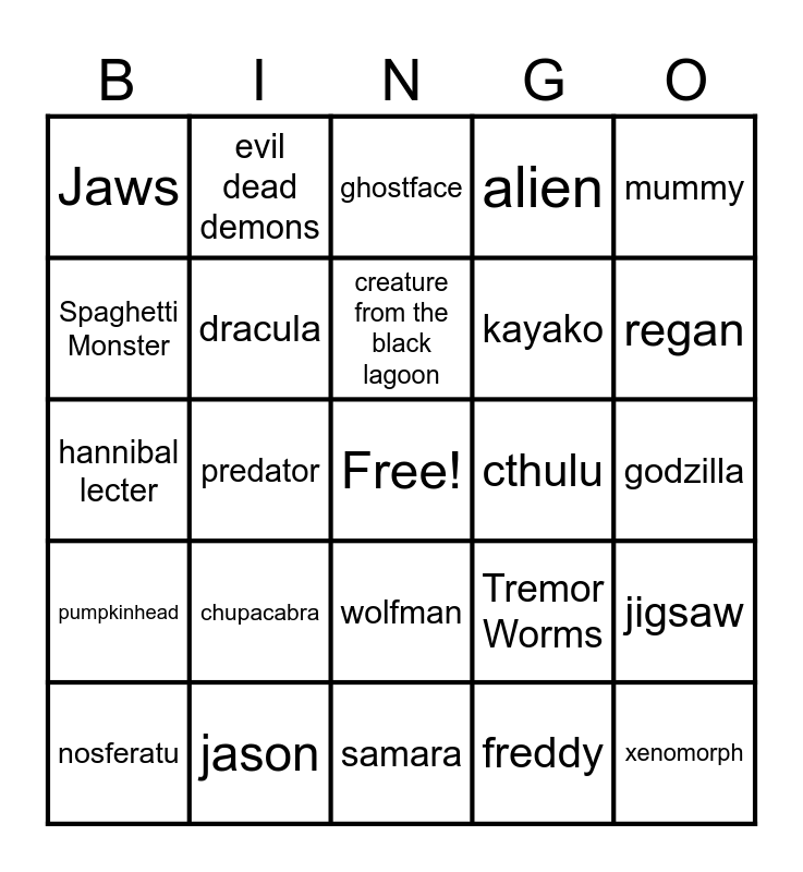 This bingo card has a free space and 39 words: phantom of the opera, the bride of frankenstein, frankenstein, dracula, nosferatu, wolfman, creature from the black lagoon, invisibleman, mummy, pumpkinhead, predator, alien, xenomorph, godzilla, cthulu, chupacabra, zombie, Jaws, Gremlin, Tremor Worms, Spaghetti Monster, samara, kayako, regan, damien, pinhead, candyman, la llorona, babadook, evil dead demons, michael, chucky, ghostface, jason, freddy, pennywise, jigsaw, hannibal lecter and leatherface.