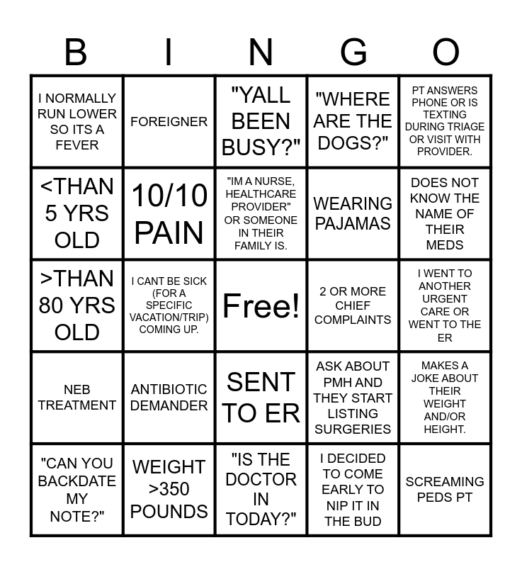 This bingo card has a free space and 24 words: ANTIBIOTIC DEMANDER, WEIGHT >350 POUNDS, "IM A NURSE, HEALTHCARE PROVIDER" OR SOMEONE IN THEIR FAMILY IS., "CAN YOU BACKDATE MY NOTE?", PT ANSWERS PHONE OR IS TEXTING DURING TRIAGE OR VISIT WITH PROVIDER., I NORMALLY RUN LOWER SO ITS A FEVER, <THAN 5 YRS OLD, FOREIGNER, 2 OR MORE CHIEF COMPLAINTS, SENT TO ER, WEARING PAJAMAS, >THAN 80 YRS OLD, ASK ABOUT PMH AND THEY START LISTING SURGERIES, MAKES A JOKE ABOUT THEIR WEIGHT AND/OR HEIGHT., 10/10 PAIN, I DECIDED TO COME EARLY TO NIP IT IN THE BUD, I WENT TO ANOTHER URGENT CARE OR WENT TO THE ER, "YALL BEEN BUSY?", DOES NOT KNOW THE NAME OF THEIR MEDS, I CANT BE SICK (FOR A SPECIFIC VACATION/TRIP) COMING UP., SCREAMING PEDS PT, NEB TREATMENT, "WHERE ARE THE DOGS?" and "IS THE DOCTOR IN TODAY?".