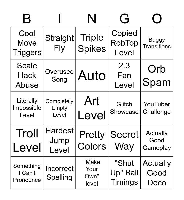 This bingo card has 25 words: Hardest Jump Level, "Make Your Own" level, Auto, Something I Can't Pronounce, Buggy Transitions, Cool Move Triggers, Scale Hack Abuse, Straight Fly, Glitch Showcase, Pretty Colors, 2.3 Fan Level, Literally Impossible Level, Secret Way, Actually Good Gameplay, Overused Song, Actually Good Deco, YouTuber Challenge, Triple Spikes, Orb Spam, Completely Empty Level, Art Level, Incorrect Spelling, Troll Level, Copied RobTop Level and "Shut Up" Ball Timings.