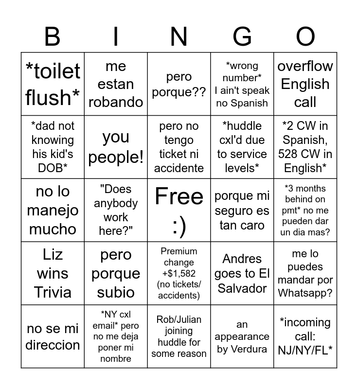 This bingo card has a free space and 24 words: pero porque subio, *NY cxl email* pero no me deja poner mi nombre, pero no tengo ticket ni accidente, no se mi direccion, overflow English call, *toilet flush*, *dad not knowing his kid's DOB*, me estan robando, porque mi seguro es tan caro, Premium change +$1,582 (no tickets/ accidents), *huddle cxl'd due to service levels*, no lo manejo mucho, Andres goes to El Salvador, me lo puedes mandar por Whatsapp?, you people!, an appearance by Verdura, *3 months behind on pmt* no me pueden dar un dia mas?, pero porque??, *2 CW in Spanish, 528 CW in English*, "Does anybody work here?", *incoming call: NJ/NY/FL*, Liz wins Trivia, *wrong number* I ain't speak no Spanish and Rob/Julian joining huddle for some reason.
