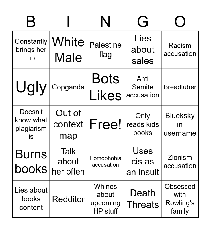 This bingo card has a free space and 24 words: Talk about her often, Redditor, Bots Likes, Lies about books content, Racism accusation, Constantly brings her up, Ugly, White Male, Only reads kids books, Homophobia accusation, Anti Semite accusation, Doesn't know what plagiarism is, Uses cis as an insult, Zionism accusation, Copganda, Death Threats, Blueksky in username, Palestine flag, Breadtuber, Out of context map, Obsessed with Rowling's family, Burns books, Lies about sales and Whines about upcoming HP stuff.