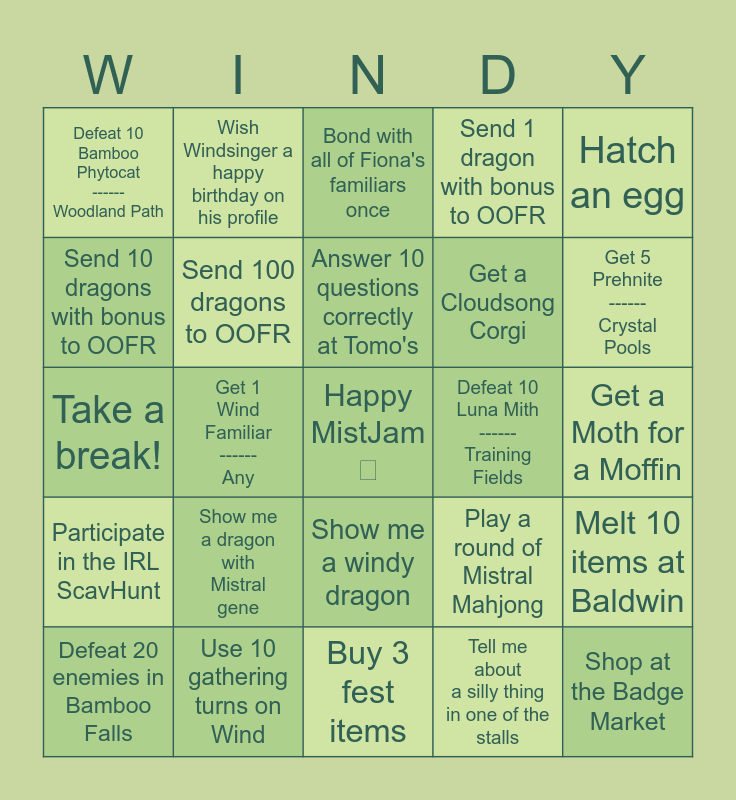 This bingo card has a free space and 35 words: Send 1 dragon to OOFR, Send 10 dragons to OOFR, Send 50 dragons to OOFR, Send 100 dragons to OOFR, Show me a windy dragon, Send 1 dragon with bonus to OOFR, Send 10 dragons with bonus to OOFR, Convert 50 insects to food, Answer 10 questions correctly at Tomo's, Buy a ticket for Roundsey, Take a break!, Hatch an egg, Dig 10 times at Ancient Aerie, Get 50 Messenger Scrolls, Defeat 10 Bamboo Phytocat ------ Woodland Path, Defeat 10 Luna Mith ------ Training Fields, Tell me about a silly thing in one of the stalls, Get 1 Wind Familiar ------ Any, Participate in the IRL ScavHunt, Shop at the Badge Market, Play a round of Mistral Mahjong, Defeat 20 enemies in Bamboo Falls, Melt 10 items at Baldwin, Use 10 gathering turns on Wind, Bond with all of Fiona's familiars once, Get 5 Prehnite ------ Crystal Pools, Give Windsinger a tasty treat!, Get 5 Silken Feathers ------ Training Fields, Get a Cloudsong Corgi, Get a Moth for a Moffin, Get some foddart, Buy 3 fest items, Show me a dragon with Mistral gene, Wish Windsinger a happy birthday on his profile and Get a Bottled Bauble.
