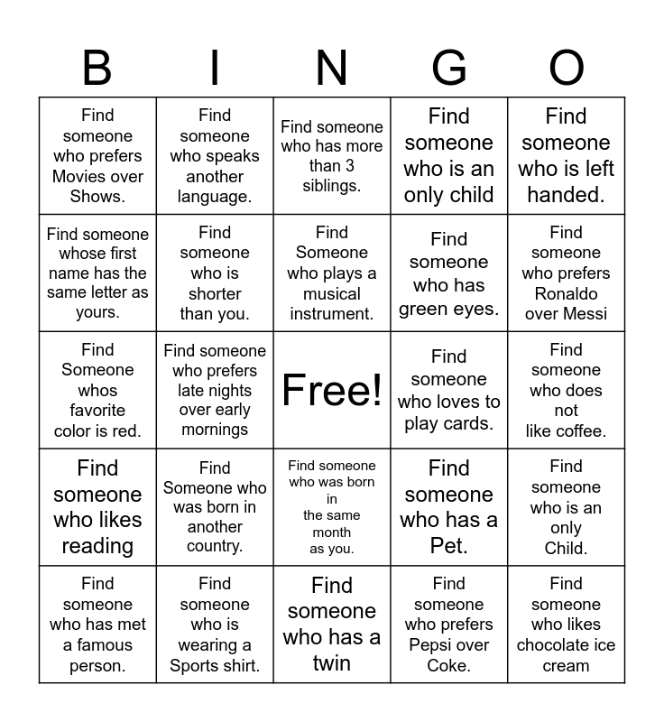 This bingo card has a free space and 24 words: Find Someone who was born in another country., Find someone who is wearing a Sports shirt., Find Someone who plays a musical instrument., Find someone who has met a famous person., Find someone who is left handed., Find someone who prefers Movies over Shows., Find someone whose first name has the same letter as yours., Find someone who speaks another language., Find someone who loves to play cards., Find someone who was born in the same month as you., Find someone who has green eyes., Find Someone whos favorite color is red., Find someone who has a Pet., Find someone who is an only Child., Find someone who is shorter than you., Find someone who prefers Pepsi over Coke., Find someone who does not like coffee., Find someone who has more than 3 siblings., Find someone who prefers Ronaldo over Messi, Find someone who prefers late nights over early mornings, Find someone who likes chocolate ice cream, Find someone who likes reading, Find someone who is an only child and Find someone who has a twin.