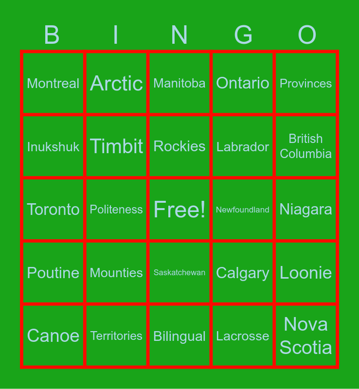 This bingo card has a free space and 40 words: Vancouver, Toronto, Toque, Timbit, Territories, Saskatchewan, Rockies, Quebec, Provinces, Poutine, Politeness, Ontario, Nova Scotia, Niagara, Newfoundland, Mounties, Moose, Montreal, Maple Syrup, Manitoba, Loonie, Lacrosse, Labrador, Inukshuk, Igloo, Hockey, Great Lakes, Eh, Curling, CN Tower, Caribou, Canoe, Canada Goose, Calgary, British Columbia, Bilingual, Beaver, Banff, Arctic and Alberta.