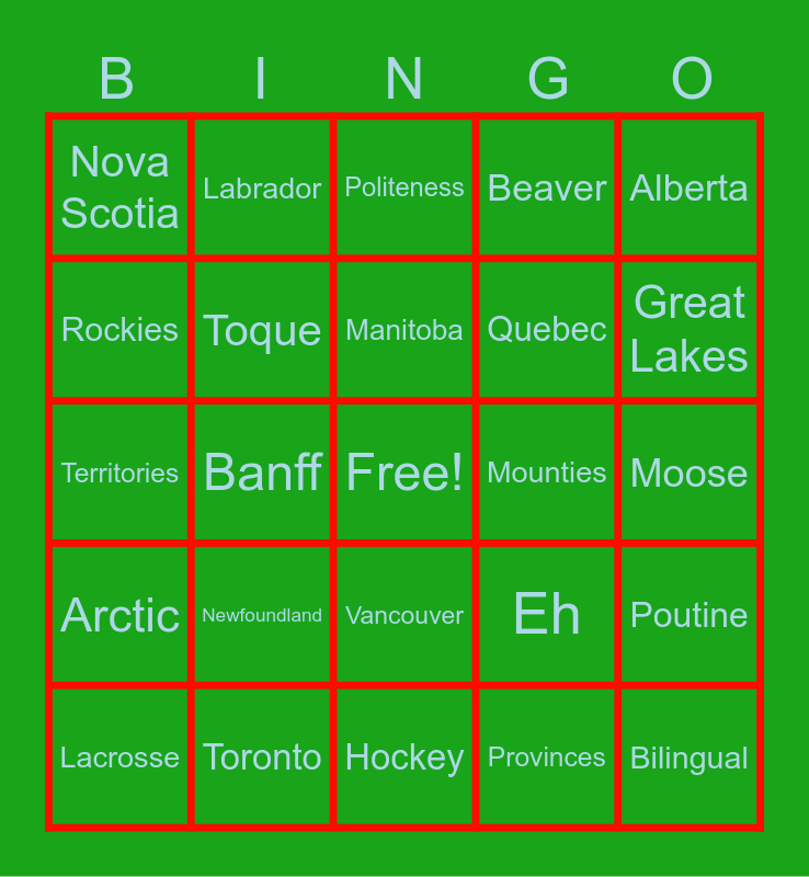 This bingo card has a free space and 40 words: Saskatchewan, Territories, Timbit, Toque, Toronto, Vancouver, Manitoba, Maple Syrup, Alberta, Arctic, Banff, Beaver, Bilingual, Moose, Mounties, Newfoundland, Niagara, Nova Scotia, Ontario, Politeness, Poutine, Provinces, Quebec, Rockies, British Columbia, Calgary, Canada Goose, Canoe, Caribou, CN Tower, Curling, Lacrosse, Loonie, Eh, Great Lakes, Hockey, Igloo, Inukshuk, Labrador and Montreal.