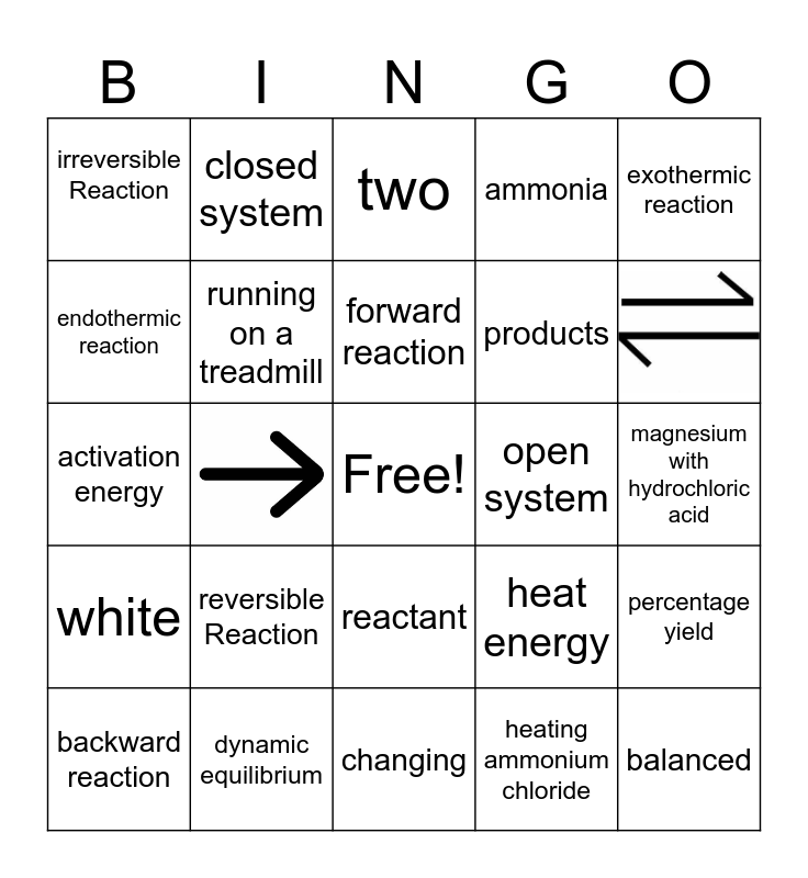 This bingo card has 2 images, a free space and 22 words: reversible Reaction, dynamic equilibrium, forward reaction, backward reaction, exothermic reaction, irreversible Reaction, endothermic reaction, closed system, open system, reactant, products, activation energy, heat energy, percentage yield, running on a treadmill, heating ammonium chloride, magnesium with hydrochloric acid, two, balanced, white, ammonia and changing.