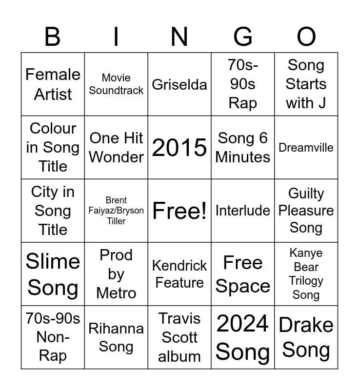 This bingo card has a free space and 25 words: Prod by Metro, Travis Scott album, 2015, 70s-90s Non-Rap, Song Starts with J, Female Artist, Colour in Song Title, Movie Soundtrack, Interlude, Kendrick Feature, Song 6 Minutes, City in Song Title, Free Space, Kanye Bear Trilogy Song, One Hit Wonder, UK Artist, Guilty Pleasure Song, Griselda, Dreamville, Brent Faiyaz/Bryson Tiller, Drake Song, Rihanna Song, Slime Song, 70s-90s Rap and 2024 Song.