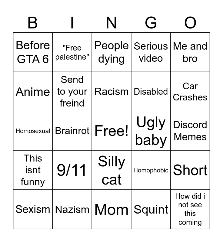 This bingo card has a free space and 24 words: 9/11, Nazism, Racism, Sexism, Me and bro, Before GTA 6, Anime, "Free palestine", Ugly baby, Silly cat, Disabled, Homosexual, Homophobic, Short, Send to your freind, Squint, Discord Memes, People dying, Car Crashes, Brainrot, How did i not see this coming, This isnt funny, Serious video and Mom.