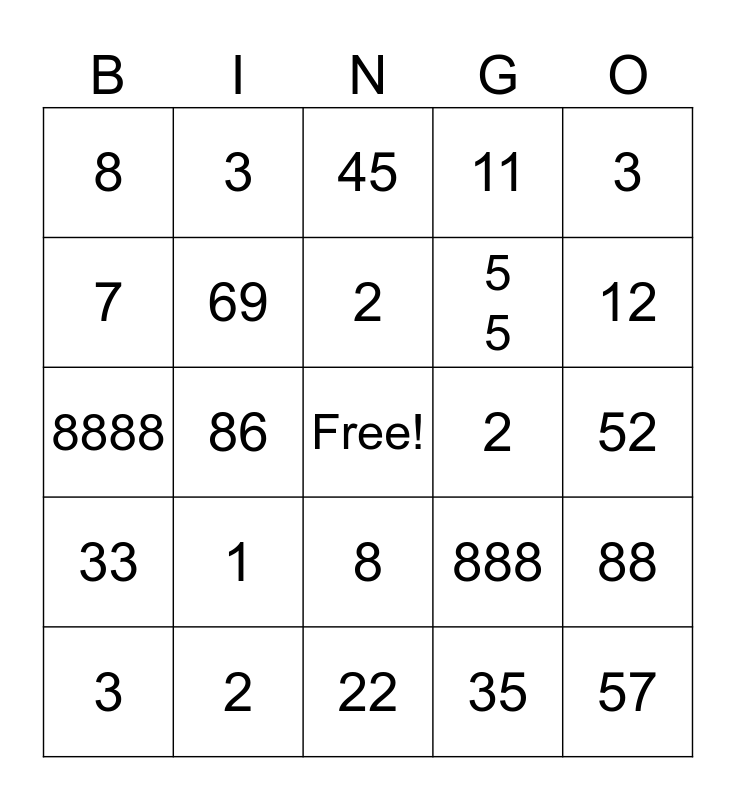 This bingo card has a free space and 24 words: 1, 2, 2, 3, 3, 8, 7, 3, 2, 8, 5 5, 8888, 888, 88, 69, 35, 52, 45, 12, 86, 57, 33, 11 and 22.