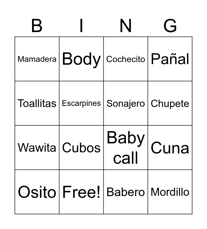 This bingo card has 21 words: Free!, Pure de manzana, Body, Gorrito, Babero, Sonajero, Mamadera, Cochecito, Baby call, Chupete, Wawita, Pañal, Mordillo, Medias, Escarpines, Mochila, Osito, Cubos, Toallitas, Cuna and Sillita.