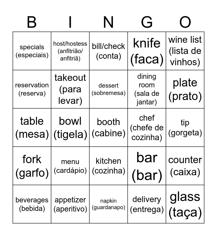This bingo card has a free space and 24 words: menu (cardápio), appetizer (aperitivo), dessert (sobremesa), beverages (bebida), wine list (lista de vinhos), specials (especiais), reservation (reserva), host/hostess (anfitrião/ anfitriã), chef (chefe de cozinha), kitchen (cozinha), dining room (sala de jantar), table (mesa), bar (bar), counter (caixa), takeout (para levar), delivery (entrega), tip (gorgeta), bill/check (conta), plate (prato), bowl (tigela), glass (taça), fork (garfo), knife (faca) and napkin (guardanapo).