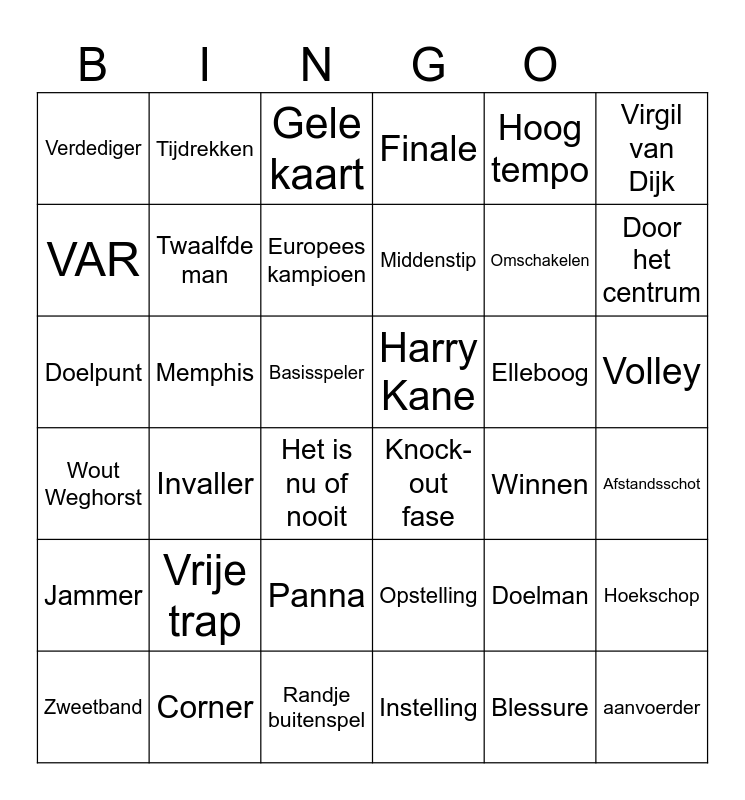 This bingo card has 82 words: Buitenspel, Penalty, Gele kaart, Hands, Keeper, Schwalbe, aanvoerder, Wissel, Blessure, Spits, Reserve bank, Scheidsrechter, VAR, Memphis, Middenvelder, Verdediger, Het is nu of nooit, Virgil van Dijk, Hup Holland!, Corner, Instelling, Europees kampioen, Doelpunt, Hoog tempo, Door het centrum, Rode kaart, Over de Flanken, de 4e man, Mooie pass, Ingooi, Elleboog, Actie, Omschakelen, Jammer, Panna, Winnen, Verliezen, Hattrick, Middenstip, Hoekschop, Randje buitenspel, Finale, Kansloos, Laatste minuut, Extra tijd, Tijdrekken, Dortmund, Twaalfde man, Eenrichtingsverkeer, Pinchhitter, Opstelling, Basisspeler, Knock-out fase, Kans, Mogelijkheid, Paal, Lat, Kopbal, Pegel, Wout Weghorst, Koeman, Cody Gakpo, Harry Kane, Doelman, Redding, Aanval, Sliding, Voordeel, Warming-up, Dubbele wissel, Fans, Voetbalschoen, Volley, Afstandsschot, Één op één, Overtreding, Zweetband, Volkslied, Vrije trap, Juichen, Invaller and Blessure tijd.