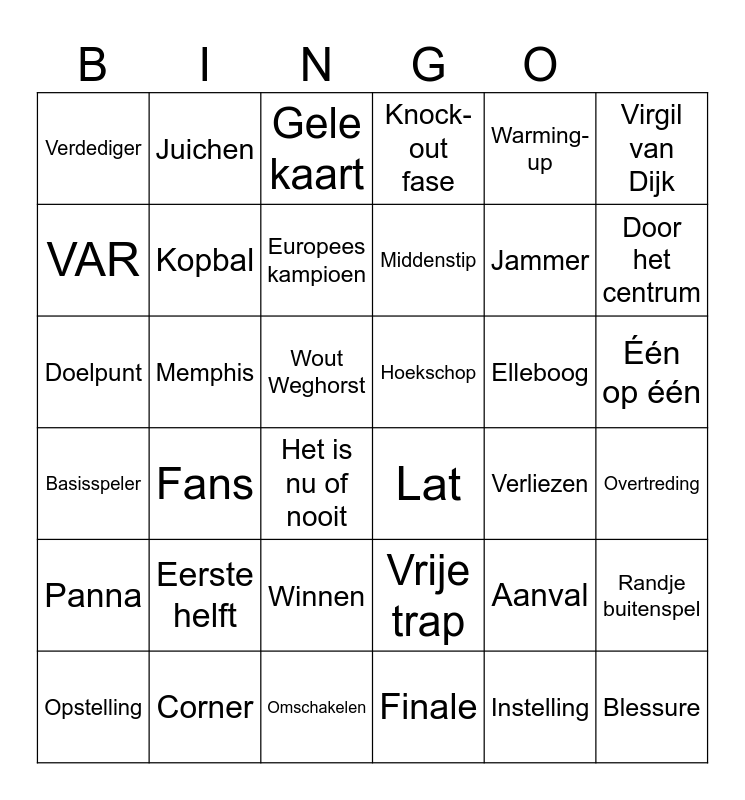 This bingo card has 84 words: Buitenspel, Penalty, Gele kaart, Hands, Keeper, Schwalbe, aanvoerder, Wissel, Blessure, Spits, Reserve bank, Scheidsrechter, VAR, Memphis, Middenvelder, Verdediger, Het is nu of nooit, Virgil van Dijk, Hup Holland!, Corner, Instelling, Europees kampioen, Doelpunt, Hoog tempo, Door het centrum, Rode kaart, Over de Flanken, de 4e man, Mooie pass, Ingooi, Elleboog, Actie, Omschakelen, Jammer, Panna, Winnen, Verliezen, Hattrick, Middenstip, Hoekschop, Randje buitenspel, Finale, Kansloos, Laatste minuut, Extra tijd, Tijdrekken, Juichen, Twaalfde man, Eenrichtingsverkeer, Pinchhitter, Opstelling, Basisspeler, Knock-out fase, Kans, Mogelijkheid, Paal, Lat, Kopbal, Pegel, Wout Weghorst, Koeman, Polen, Oostenrijk, Doelman, Redding, Aanval, Sliding, Voordeel, Warming-up, Dubbele wissel, Fans, Voetbalschoen, Volley, Afstandsschot, Één op één, Overtreding, Zweetband, Roemenië, Berlijn, Vrije trap, Eerste helft, Volkslied, Invaller and Blessure tijd.