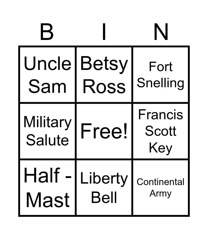 This bingo card has a free space and 28 words: Independence Day, Red, White, & Blue, America the Beautiful, Old Glory, Francis Scott Key, Fort Snelling, Betsy Ross, Stars & Stripes, God Bless America, Pledge of Allegiance, American Flag, Military Salute, American Legion, Yankee Doodle, Star Spangled Banner, George Washington, Patriotism, Half - Mast, Liberty Bell, Bill of Rights, Uncle Sam, United States, Founding Fathers, Washington D.C., National Anthem, Declaration of Independence, Continental Army and Independence Day.
