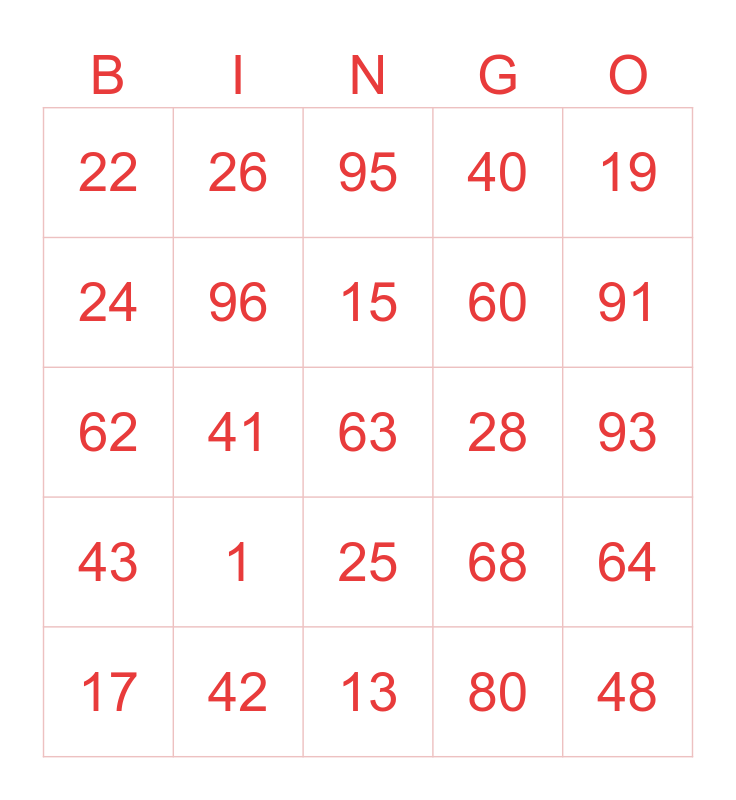 This bingo card has a free space and 25 words: 1, 13, 15, 17, 19, 22, 24, 26, 28, 25, 60, 62, 68, 64, 96, 99, 93, 95, 91, 41, 48, 42, 43, 40 and 80.