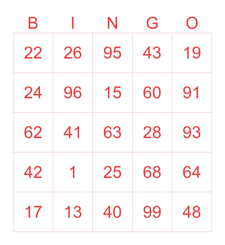 This bingo card has a free space and 24 words: 1, 13, 15, 17, 19, 22, 24, 26, 28, 25, 60, 62, 68, 64, 96, 99, 93, 95, 91, 41, 48, 42, 43 and 40.