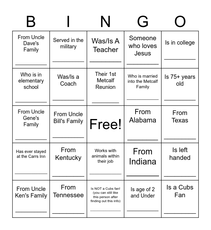 This bingo card has a free space and 29 words: From Uncle Ken's Family __________, From Uncle Bob's Family ___________, From Uncle Bill's Family __________, From Uncle Jim's Family _________, From Uncle Dave's Family ___________, Was/Is A Teacher ________, Was/Is a Coach __________, From Kentucky _________, From Alabama ________, From Tennessee _________, From Texas _________, Is a Cubs Fan _________, Is NOT a Cubs fan! (you can still like this person after finding out this info) ________________, Is age of 2 and Under ___________, Is 75+ years old __________, Is retired ___________, Works with animals within their job _____________, Has ever stayed at the Carrs Inn ______________, Is in college __________, From Uncle Gene's Family ___________, From Indiana _______, Work requires them to drive a semi truck ____________, Who is married into the Metcalf Family _____________, Who is in elementary school ___________, Someone who loves Jesus _________, Served in the military ___________, Is left handed _________, Their 1st Metcalf Reunion _________ and Been Married over 30 years __________.