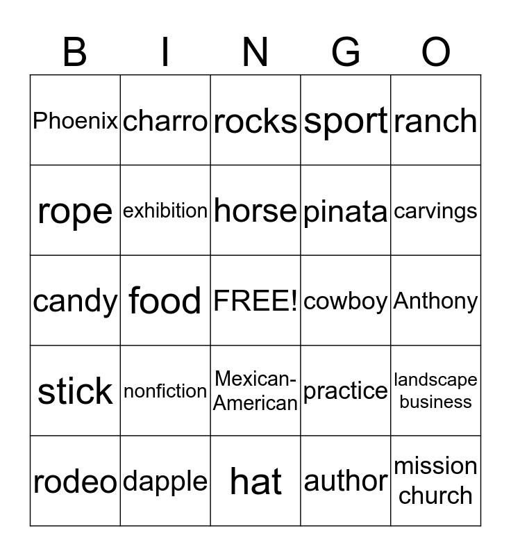 This bingo card has a free space and 24 words: nonfiction, dapple, horse, rodeo, ranch, Phoenix, rope, charro, cowboy, Mexican-American, pinata, candy, practice, landscape business, exhibition, author, Anthony, rocks, carvings, food, mission church, stick, sport and hat.