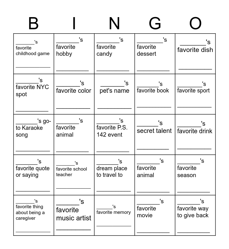 This bingo card has a free space and 24 words: _______'s favorite school teacher _____________, ______'s favorite music artist _________, _______'s pet's name __________, _______'s favorite thing about being a caregiver _____________, _______'s favorite dish _________, _______'s favorite childhood game _____________, _______'s favorite NYC spot __________, _______'s favorite hobby __________, ______'s secret talent _________, _______'s dream place to travel to ___________, _______'s favorite book ___________, _______'s go-to Karaoke song ___________, _______'s favorite animal __________, _______'s favorite season __________, _______'s favorite color __________, _______'s favorite movie __________, _______'s favorite drink __________, _______'s favorite candy __________, ________'s favorite sport ___________, _______'s favorite animal __________, _______'s favorite way to give back __________, _______'s favorite quote or saying ___________, ________'s favorite dessert __________ and ______'s favorite memory _____________.