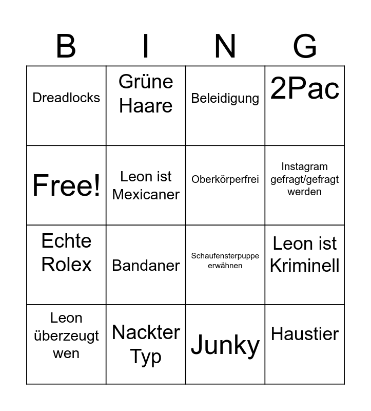 This bingo card has 16 words: Nackter Typ, Leon ist Kriminell, Beleidigung, Dreadlocks, Echte Rolex, Grüne Haare, Schaufensterpuppe erwähnen, Junky, Free!, Leon ist Mexicaner, Leon überzeugt wen, 2Pac, Bandaner, Instagram gefragt/gefragt werden, Oberkörperfrei and Haustier.