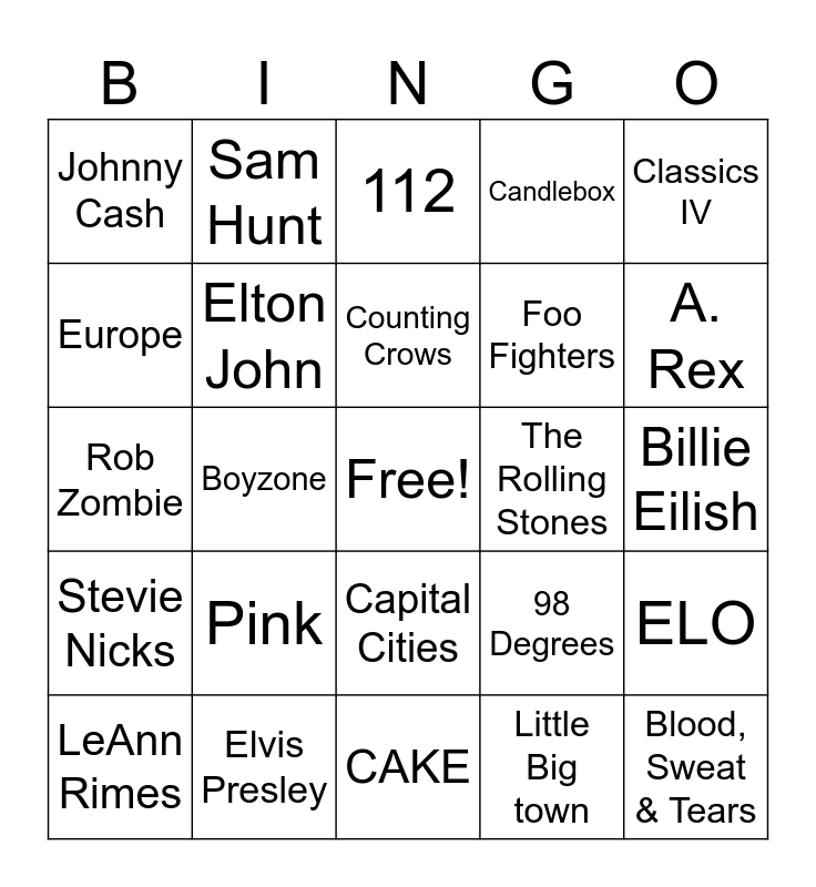 This bingo card has a free space and 56 words: Avril Lavigne, LeAnn Rimes, Uncle Kracker, Johnny Cash, CAKE, Of Monsters and Men, Elton John, Cracker, Foo Fighters, Ariana Grande, Candlebox, Hot Hot Heat, Rick Derringer, Wolfmother, AC/DC, Third Eye Blind, Classics IV, Boyzone, MAGIC!, Blood, Sweat & Tears, The Rolling Stones, "Weird Al" Yankovic, 98 Degrees, 112, Gorillaz, Counting Crows, No Doubt, Radiohead, A. Rex, System of a Down, Bad Wolves, The Supremes, Katy Perry, Seven Mary Three, Billie Eilish, Europe, Rob Zombie, Everclear, Stevie Nicks, Sam Hunt, Capital Cities, The O’Jays, Papa Roach, Backstreet Boys, Jimi Hendrix, Pink, Elvis Presley, Van Halen, LEN, Janet Jackson, Little Big town, Gym Class Heroes, Disturbed, Frankie Valli & the 4 Seasons, ELO and Public Enemy.