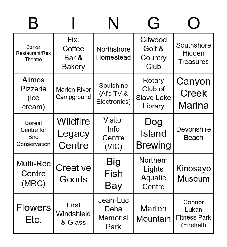This bingo card has a free space and 24 words: Creative Goods, First Windshield & Glass, Soulshine (Al's TV & Electronics), Flowers Etc., Southshore Hidden Treasures, Carlos Restaurant/Rex Theatre, Alimos Pizzeria (ice cream), Fix. Coffee Bar & Bakery, Dog Island Brewing, Big Fish Bay, Rotary Club of Slave Lake Library, Boreal Centre for Bird Conservation, Northern Lights Aquatic Centre, Kinosayo Museum, Marten River Campground, Marten Mountain, Devonshire Beach, Northshore Homestead, Canyon Creek Marina, Wildfire Legacy Centre, Connor Lukan Fitness Park (Firehall), Multi-Rec Centre (MRC), Gilwood Golf & Country Club and Jean-Luc Deba Memorial Park.