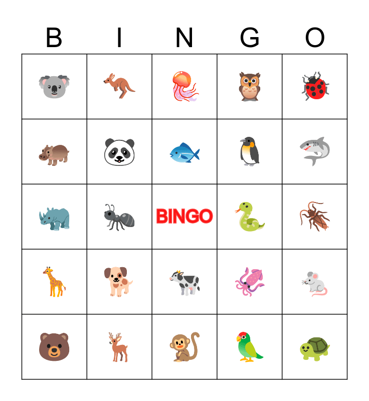This bingo card has a free space and 56 words: 🦊, 🐻, 🐹, 🐨, 🐒, 🐸, 🐼, 🦁, 🐧, 🦆, 🦉, 🦇, 🐝, 🪱, 🦋, 🐌, 🐞, 🐜, 🕷️, 🐢, 🐍, 🦎, 🦑, 🪼, 🦀, 🐟, 🐬, 🐋, 🦈, 🐊, 🐅, 🦓, 🦍, 🐘, 🪳, 🦛, 🦏, 🐪, 🦒, 🦘, 🐄, 🫏, 🐎, 🐖, 🐑, 🐕, 🦌, 🐐, 🦔, 🐈, 🦜, 🦝, 🐇, 🦩, 🐁 and 🐿️.