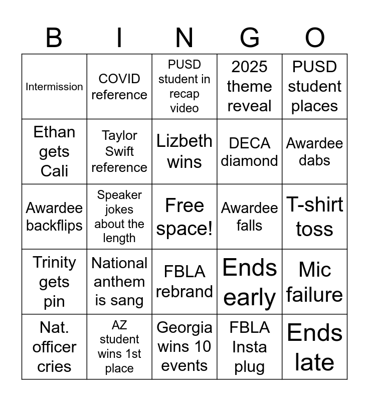 This bingo card has a free space and 24 words: National anthem is sang, AZ student wins 1st place, Lizbeth wins, Nat. officer cries, PUSD student places, Intermission, Ethan gets Cali, COVID reference, Awardee falls, FBLA rebrand, DECA diamond, Awardee backflips, Ends early, Mic failure, Taylor Swift reference, FBLA Insta plug, T-shirt toss, PUSD student in recap video, Awardee dabs, Speaker jokes about the length, Ends late, Trinity gets pin, 2025 theme reveal and Georgia wins 10 events.