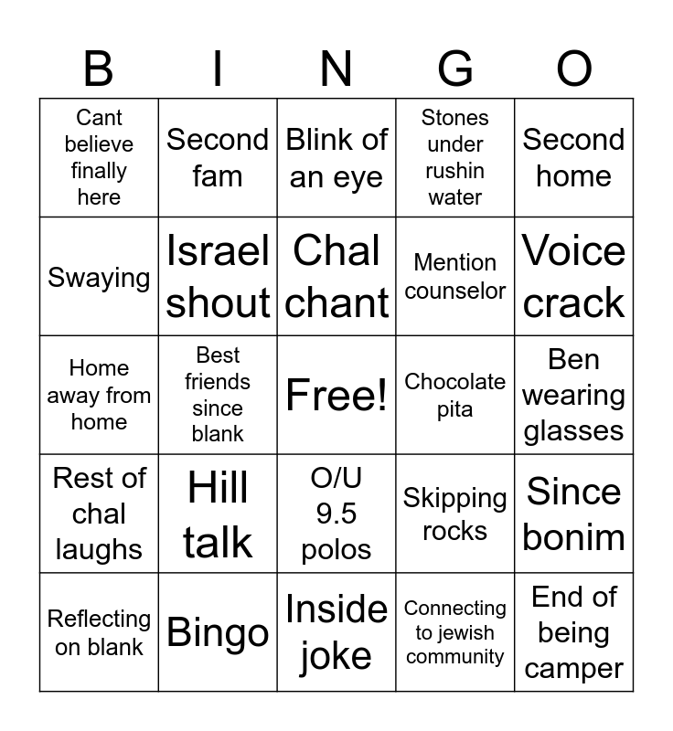 This bingo card has a free space and 24 words: Hill talk, Bingo, Chal chant, Reflecting on blank, Second home, Cant believe finally here, Swaying, Second fam, Chocolate pita, O/U 9.5 polos, Mention counselor, Home away from home, Skipping rocks, Since bonim, Israel shout, Connecting to jewish community, Ben wearing glasses, Blink of an eye, Voice crack, Best friends since blank, End of being camper, Rest of chal laughs, Stones under rushin water and Inside joke.