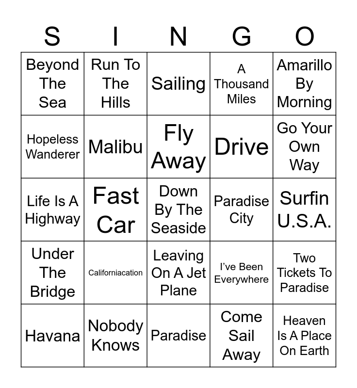 This bingo card has 75 words: Jamaica Mistaica, Kokomo, Sailing, Road Trippin’, Vienna, On The Road Again, Laredo, Beautiful Day, Good Life, Ticket To Ride, Heaven Is A Place On Earth, Sand In My Shoes, Fly Away, Hopeless Wanderer, California Dreamin’, Fast Car, Santa Monica, Down By The Seaside, If It’s The Beaches, Amarillo By Morning, Dog Days Are Over, Life Is A Highway, Malibu, Run To The Hills, A Thousand Miles, Island In The Sun, Paris, Carolina In My Mind, Traveler, Fly, Truckin’, Trench Town Rock, Budapest, I’ve Been Everywhere, Go Your Own Way, Drive, (Get Your Kicks On) Route 66, Riptide, Surfin U.S.A., Come Sail Away, Born To Be Wild, Ramble On, Marina Del Rey, Roam, Down Under, Home, Havana, Beyond The Sea, Ramblin’ Man, California Love, MargaritaVille, Leaving On A Jet Plane, Katmandu, Desert Rose, Mexico, Midnight Train To Georgia, He Went To Paris, Africa, Bama Breeze, Born To Run, Californiacation, Ends Of The Earth, Havana Daydreamin’, Im Gonna Be (500 Miles), London Calling, Paradise City, Soak Up The Sun, Angela, Beverly Hills, Two Tickets To Paradise, Under The Bridge, Nobody Knows, Rio, Paradise and If Its The Beaches.