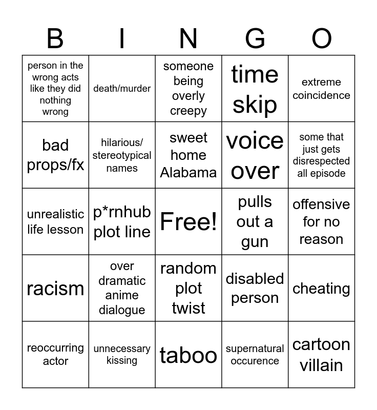 This bingo card has a free space and 24 words: over dramatic anime dialogue, unnecessary kissing, sweet home Alabama, reoccurring actor, extreme coincidence, person in the wrong acts like they did nothing wrong, bad props/fx, death/murder, pulls out a gun, random plot twist, voice over, unrealistic life lesson, disabled person, cheating, hilarious/ stereotypical names, supernatural occurence, offensive for no reason, someone being overly creepy, some that just gets disrespected all episode, p*rnhub plot line, cartoon villain, racism, time skip and taboo.