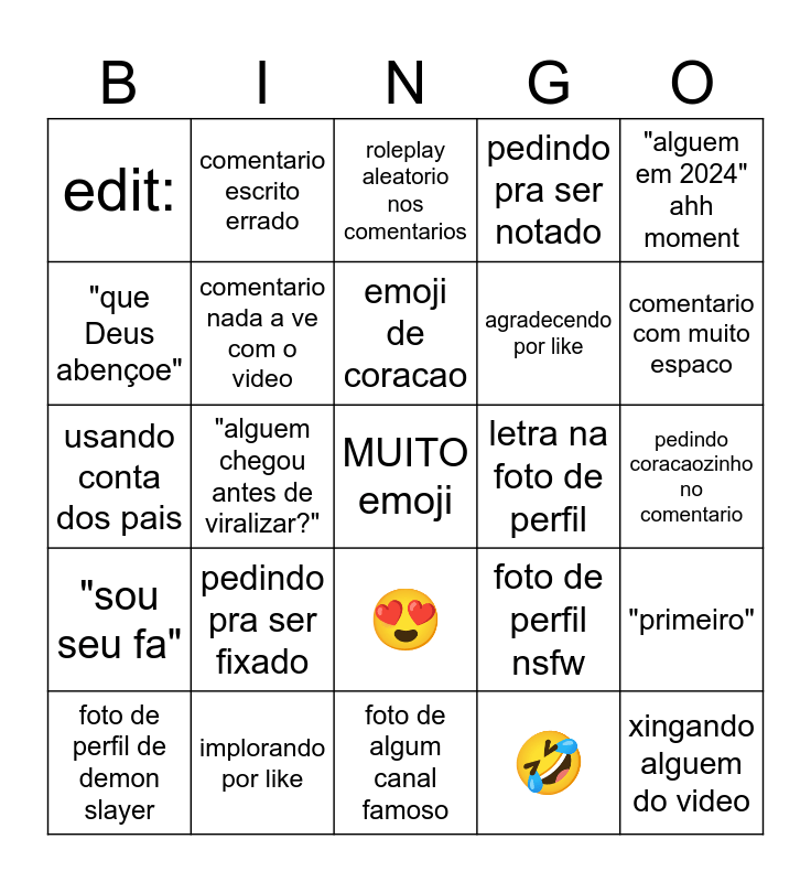 This bingo card has a free space and 24 words: pedindo pra ser fixado, implorando por like, emoji de coracao, foto de perfil de demon slayer, "alguem em 2024" ahh moment, edit:, "que Deus abençoe", comentario escrito errado, letra na foto de perfil, 😍, agradecendo por like, usando conta dos pais, foto de perfil nsfw, "primeiro", comentario nada a ve com o video, 🤣, pedindo coracaozinho no comentario, roleplay aleatorio nos comentarios, comentario com muito espaco, "alguem chegou antes de viralizar?", xingando alguem do video, "sou seu fa", pedindo pra ser notado and foto de algum canal famoso.