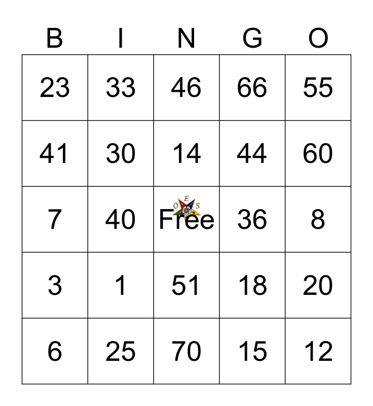 This bingo card has a free space and 24 words: 1, 25, 14, 6, 55, 23, 41, 33, 36, 51, 44, 7, 18, 20, 30, 15, 8, 46, 60, 40, 12, 3, 66 and 70.