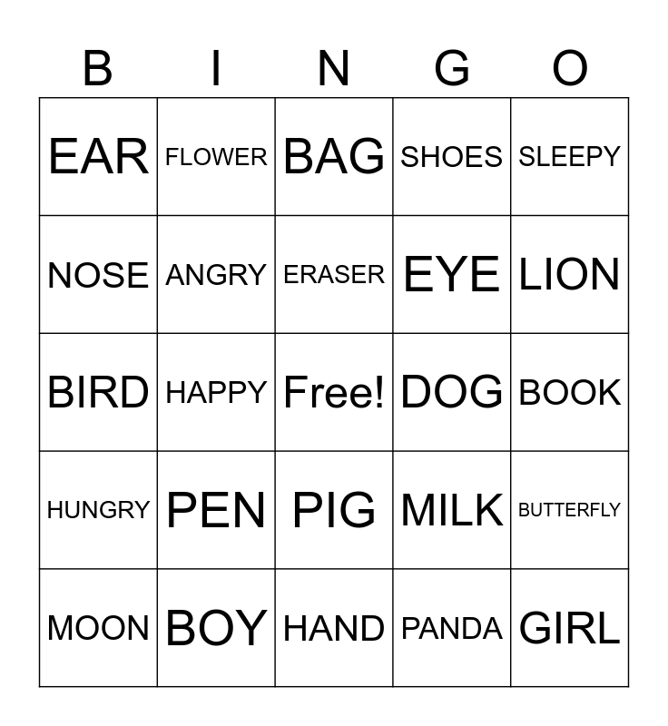This bingo card has a free space and 32 words: PANDA, JAM, HAPPY, SAD, HUNGRY, ANGRY, SLEEPY, BUTTERFLY, FLOWER, PENCIL, ERASER, BAG, RULER, CAT, DOG, SUN, MOON, BIRD, PIG, PEN, MILK, TV, BOOK, BOY, GIRL, SHOES, EYE, NOSE, EAR, HAND, FOX and LION.