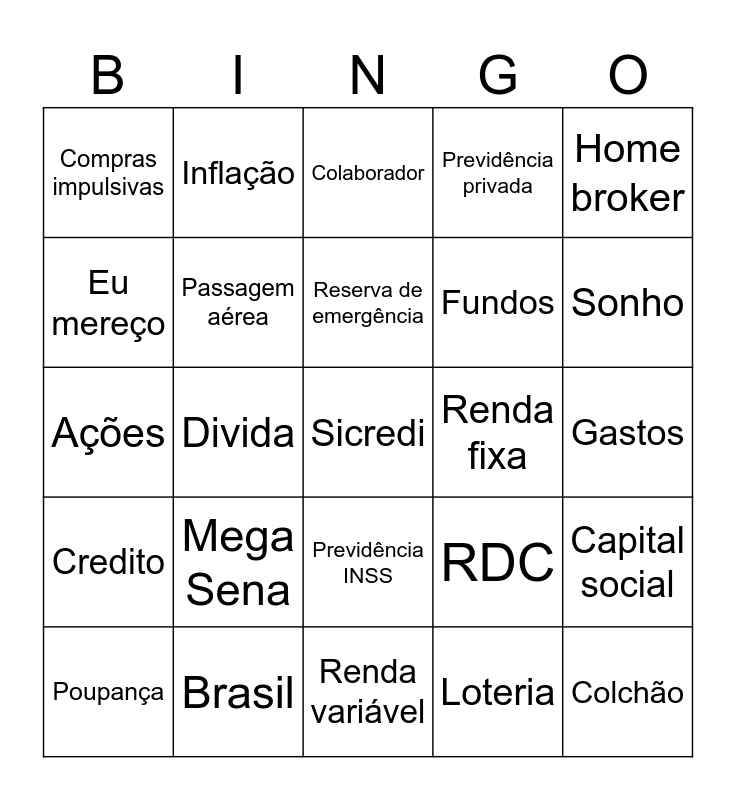 This bingo card has a free space and 24 words: Mega Sena, Brasil, Reserva de emergência, Poupança, Home broker, Compras impulsivas, Eu mereço, Inflação, Renda fixa, Previdência INSS, Fundos, Ações, RDC, Capital social, Passagem aérea, Loteria, Gastos, Colaborador, Sonho, Divida, Colchão, Credito, Previdência privada and Renda variável.
