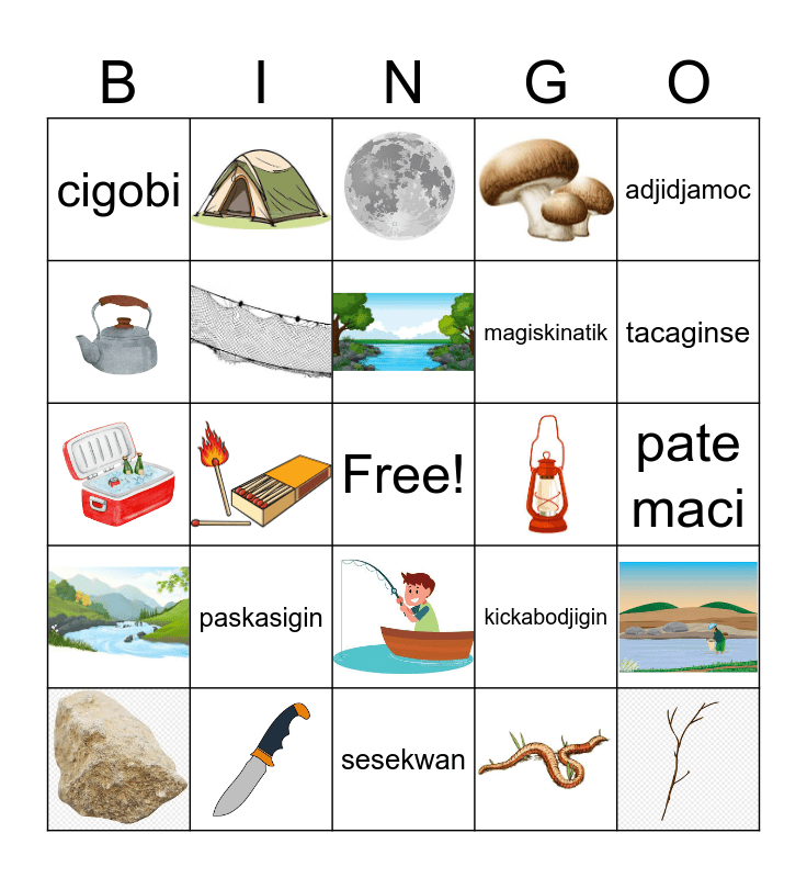 This bingo card has 50 images, a free space and 50 words: Kinebik, mokoman, sagigin, waskonedamagin, Nibicaboke, mak, ickode, tabika kisis, sigamewan, adjidjamoc, sibi, asibi, aki, ajicki, abowi, asini, sesabi, wabwan, odjickwedoc, kabisatik, nibicabokik, nigasimon, maci, kwenabi mindjoc, nibi, takisadjigin, kickatik, sesekwan, Nibic, magiskin, odji, paskasigin, podowan, magiskinatik, kwackwenabi, cigobi, tcibakwan, onagin, skite, pate maci, nadobi, nigasamonigin nigasmon, kickabodjige, kickabodjigin, tacaginse, enagoc, wagakot, wigwas, alabin and tciman.