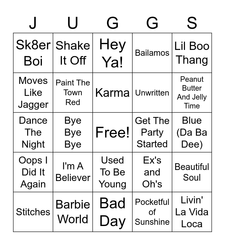 This bingo card has a free space and 41 words: Cruel Summer, Dance The Night, Vampire, Paint The Town Red, Barbie World, Used To Be Young, Karma, Mona Lisa, Lil Boo Thang, Oops I Did It Again, Bye Bye Bye, Bailamos, Livin' La Vida Loca, Blue (Da Ba Dee), Get The Party Started, I'm A Believer, Soak Up The Sun, Sk8er Boi, Whenever, Wherever, Hey Ya!, Beautiful Soul, 1, 2 Step, Bad Day, Unwritten, Crazy, Hey There Delilah, Pocketful of Sunshine, I'm Yours, Peanut Butter And Jelly Time, All About That Bass, Watch Me (Whip/Nae Nae), Shake It Off, Stitches, Roar, Ex's and Oh's, Moves Like Jagger, Hot N Cold, Sunflower, All Star, Thrift Shop and Toxic.